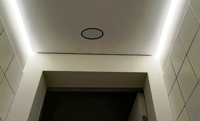 Диффузор монтируется в одной плоскости с натяжным потолком.